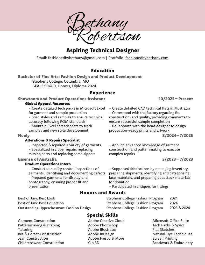 I am a technical designer and product developer who will be moving to LA in September 2025. I have a passion for developing high quality products, sustainability and inclusion. With a resourceful mindset and versatile skillset, I strive to bring success in each position I work in.