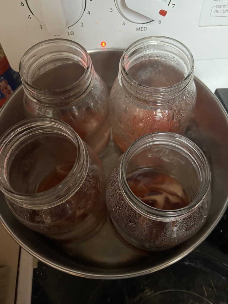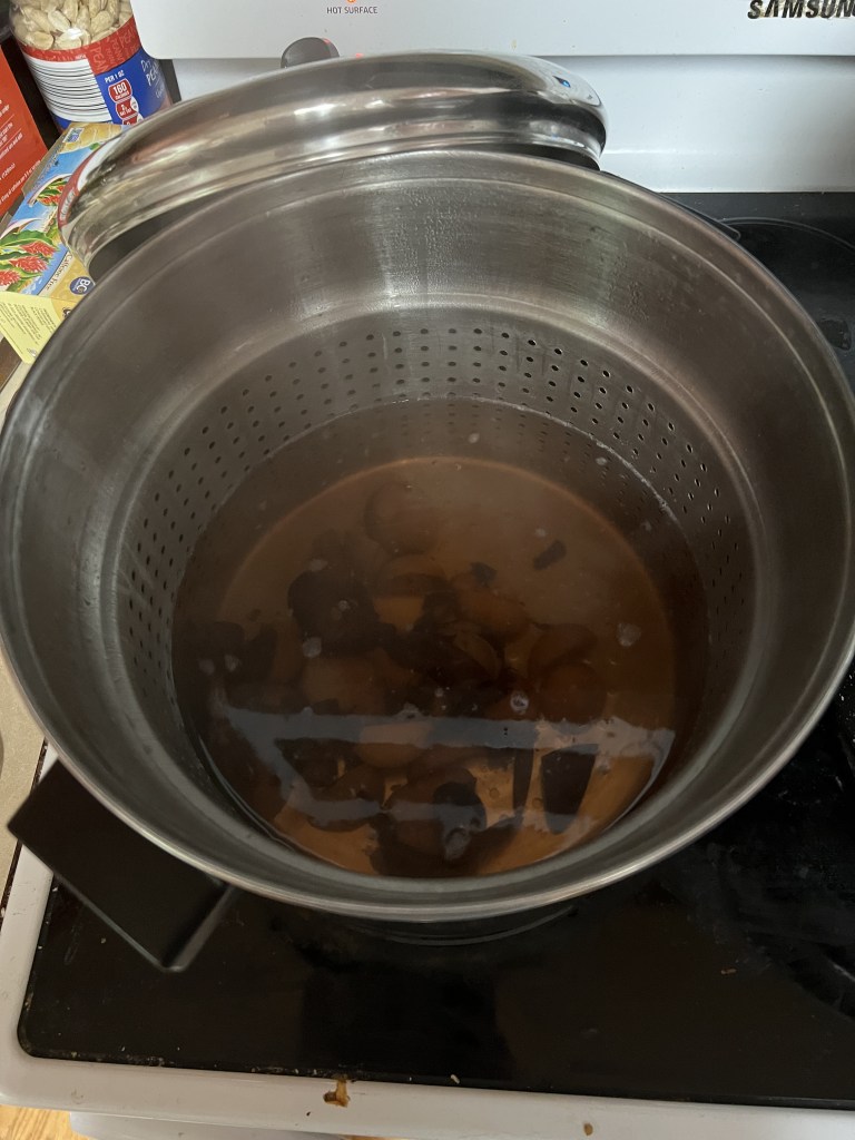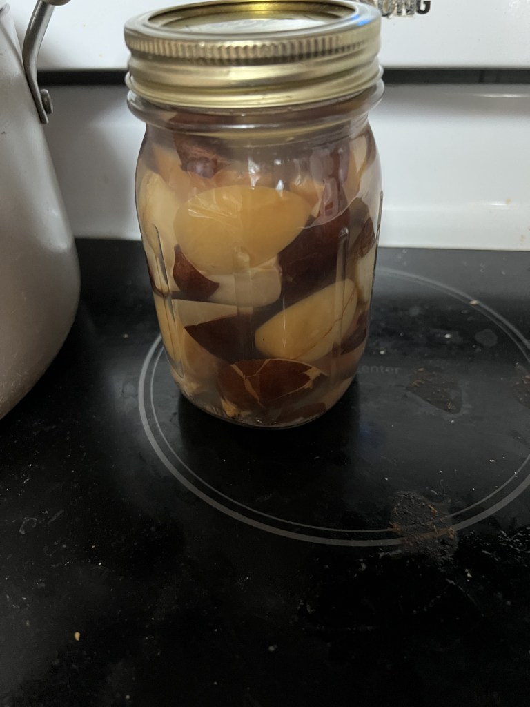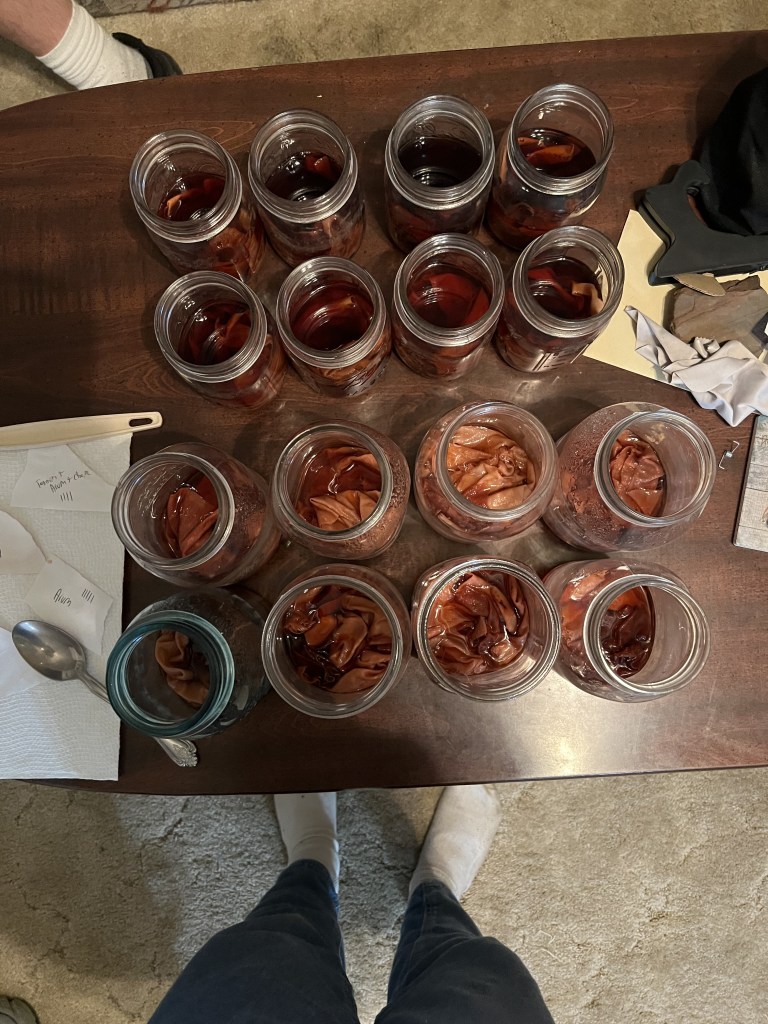 First, I started with mordanting the different fabrics. Once the mordanting was completed, I let the fabrics cure for 7 days. The night before I wished to dye my fabrics, I chopped up frozen avocado pits and boiled them in water for 30 minutes. Then, poured this mixture into a glass jar and let it soak overnight to allow for a deeper color extraction in the morning. When the morning came, I scoured my fabrics in warm water for 2-3 hours. While this occurred, I simmered the avocado pits (removed from the jar) in a pot of fresh water for 2 hours. In a separate pot, I simmered the avocado skins for 3 hours. After the simmering was complete, I strained the two dye baths for use. Each swatch was placed in their separate dye baths and steamed for 3 hours. Then, I let the swatches soak overnight. Finally, I was able to drain, rinse, and air dry the swatches.