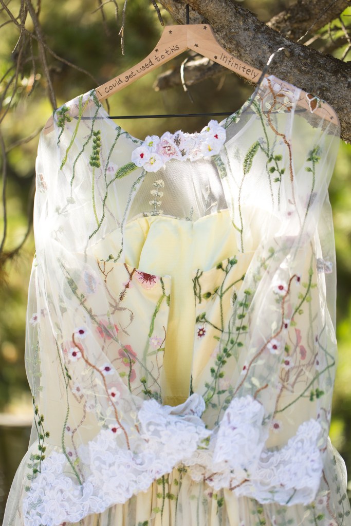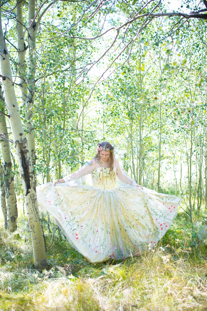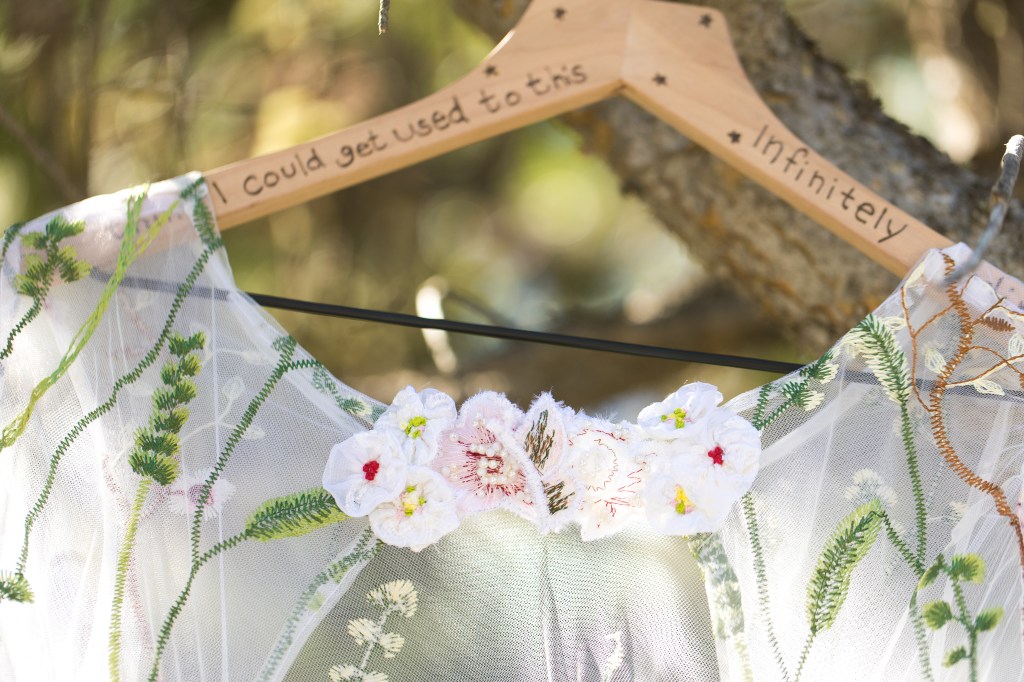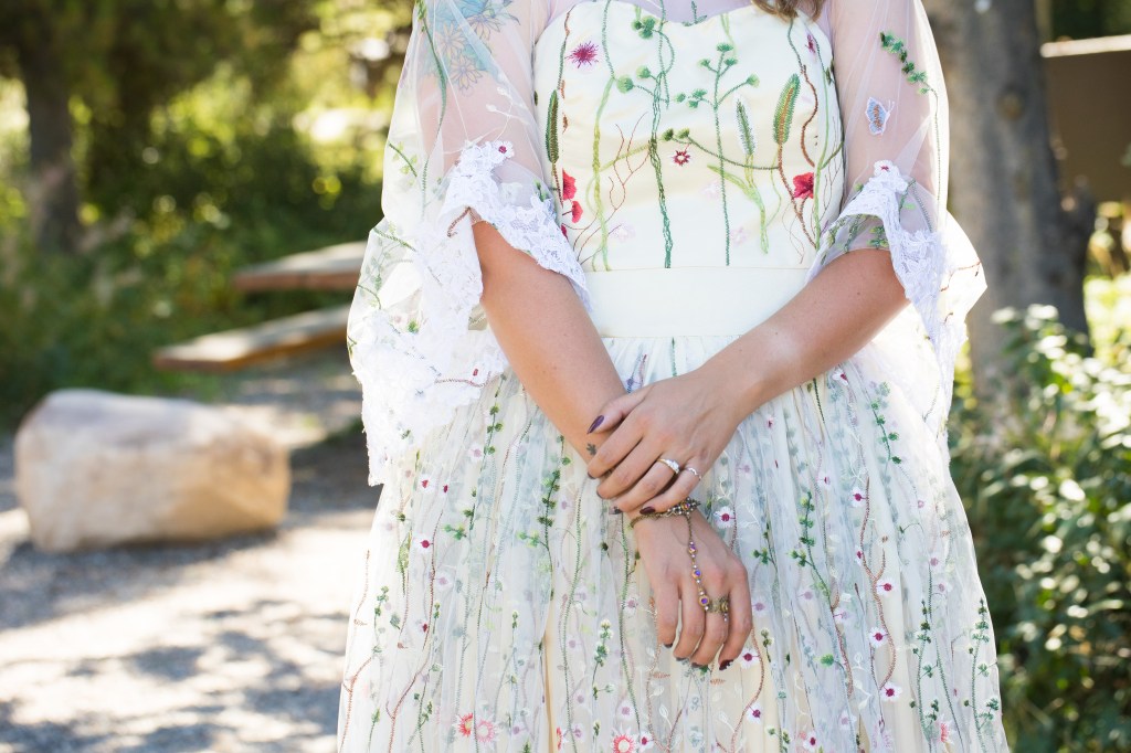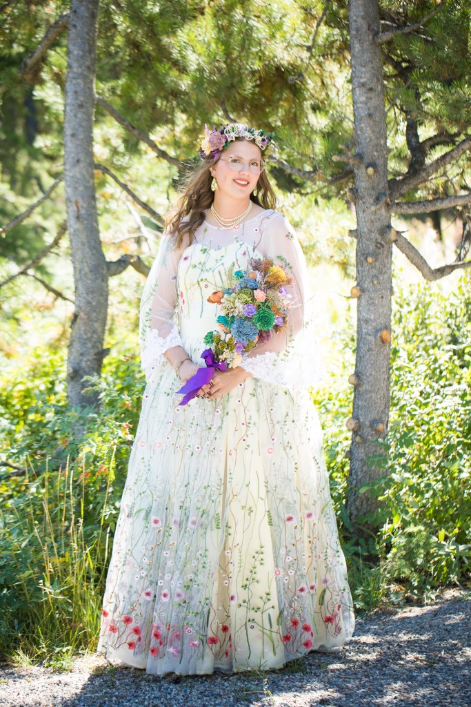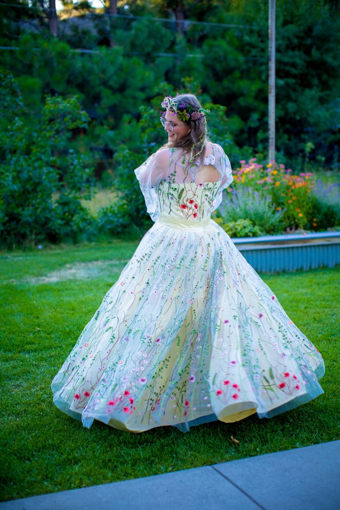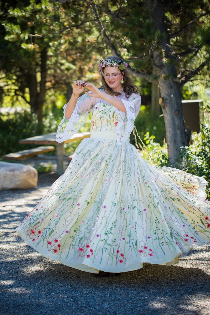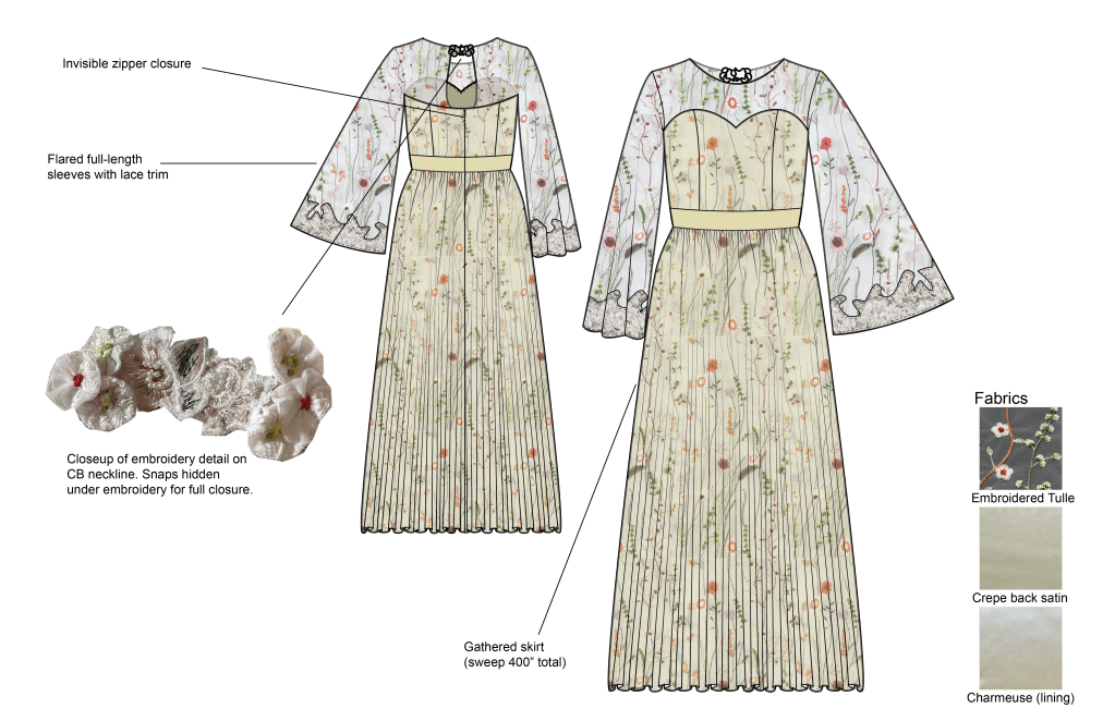I was commissioned by a bride (height at 6’2″) and her mother to make a custom wedding dress for the bride’s upcoming wedding, as she couldn’t find what she was looking for in stores. For this dress, the bride wanted a dress she could wear to more than just her wedding and to have something that fit her style. From the beginning, the bride knew she wanted a trending, colorful embroidered tulle fabric to be the main material for her dress and that she wanted “flowy” sleeves and a full skirt. Then, we worked together to design her dream dress.