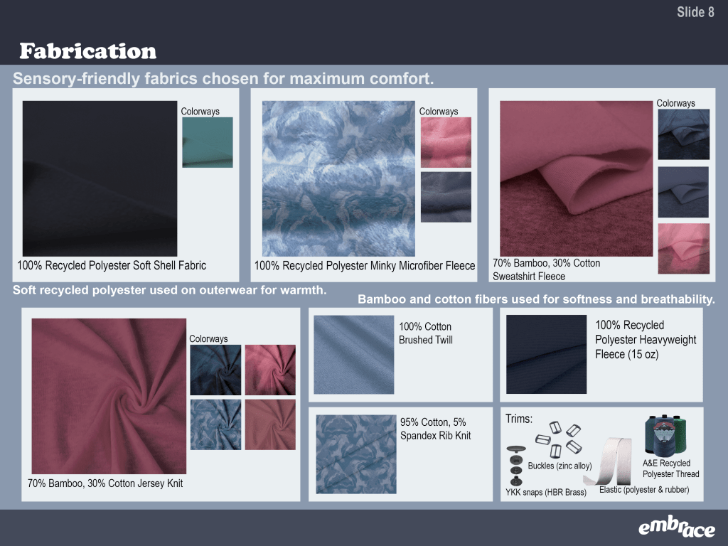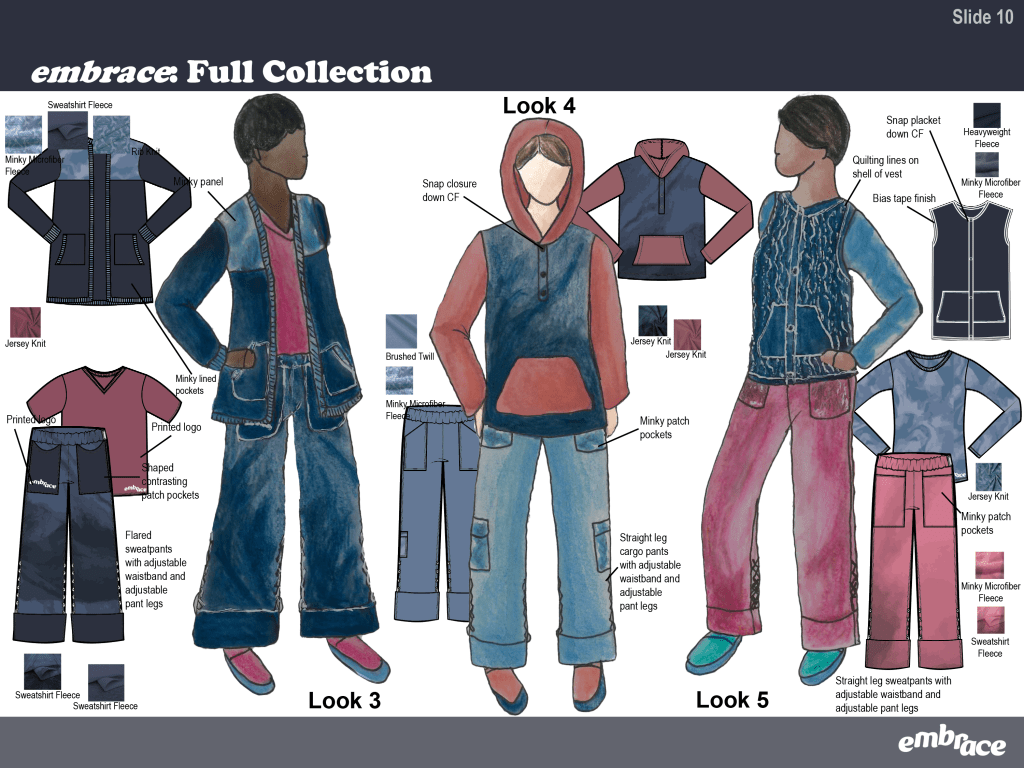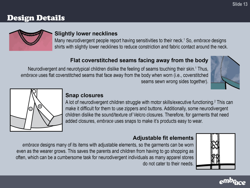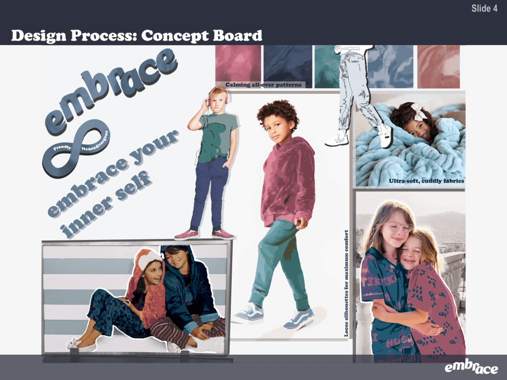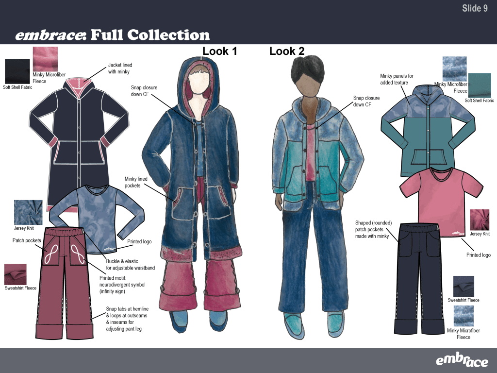 embrace is an adaptive collection designed for neurodivergent children. View the slide deck below for seeing in-depth research, viewing the collection, and getting a behind the scenes look at my design process.