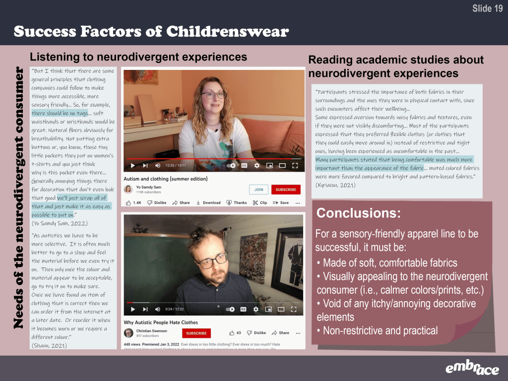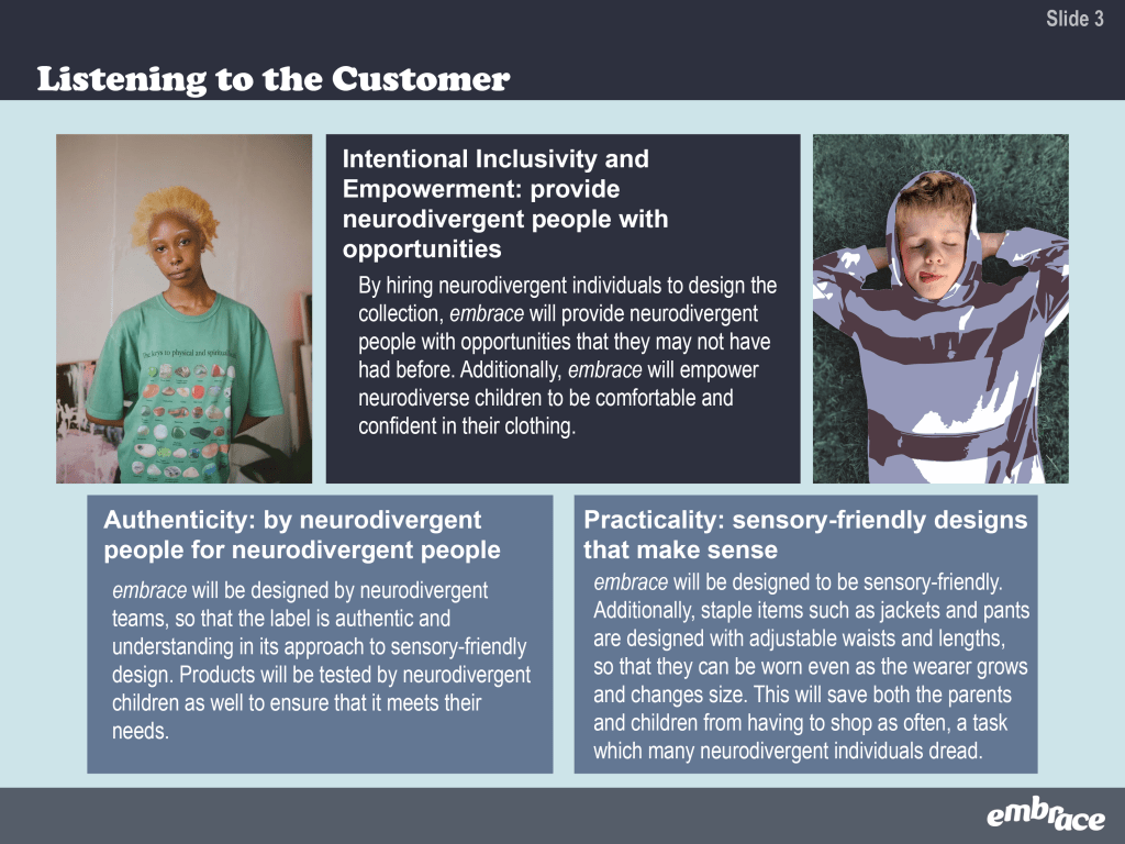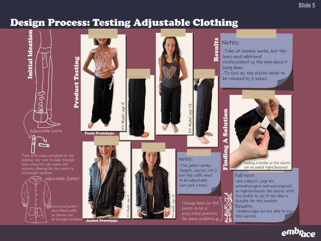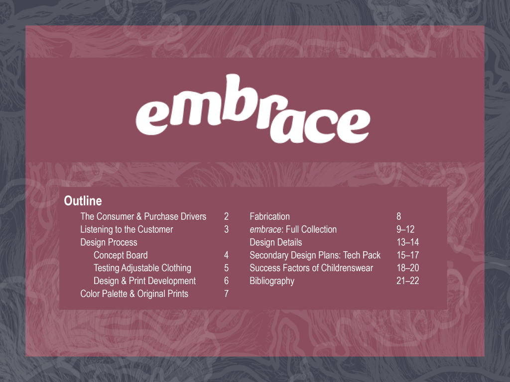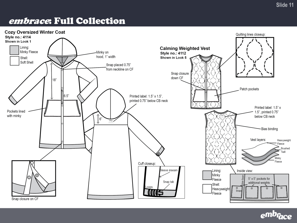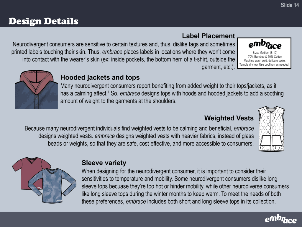 embrace is an adaptive collection designed for neurodivergent children. View the slide deck below for seeing in-depth research, viewing the collection, and getting a behind the scenes look at my design process.